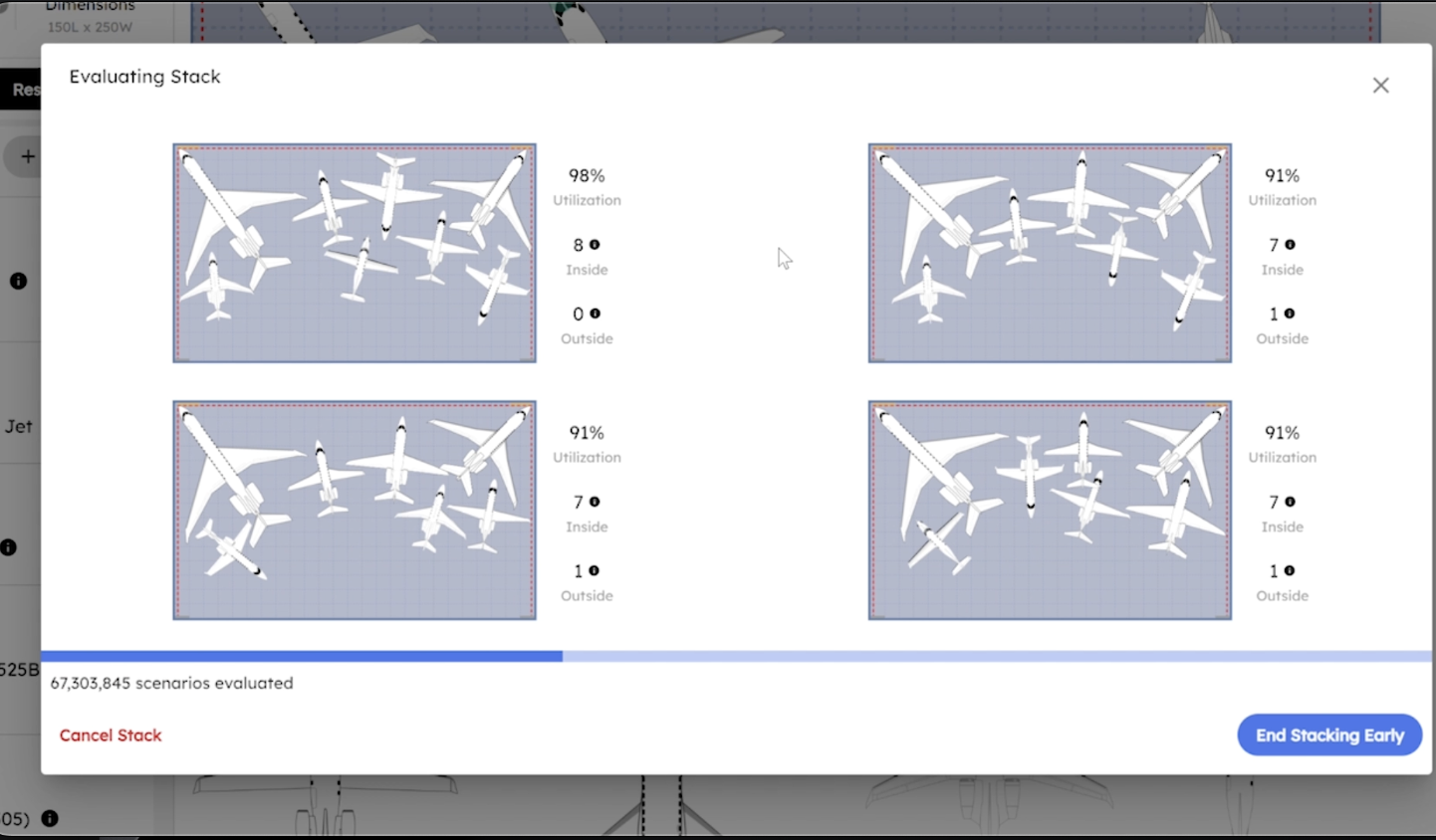 Running Autostack: When you hit “Run stack,” the algorithm processes multiple configurations simultaneously. It actually runs 12 instances of your hangar arrangement, displaying the four best options. If you see a configuration you like, you can end the stacking process early. You can also cancel at any time.