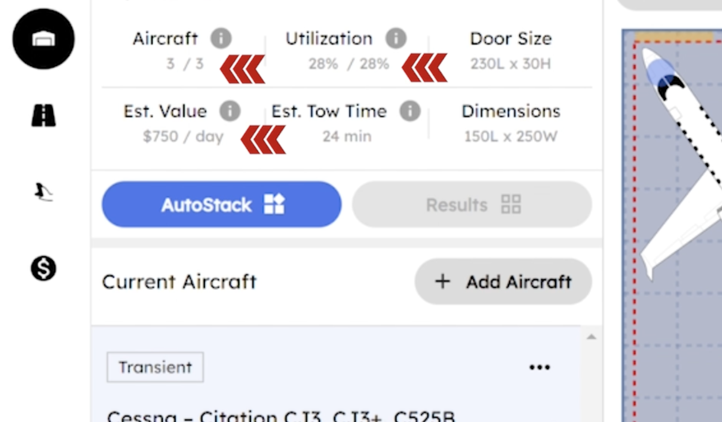- Realistic tows, modeling accurate towing characteristics. On the top left, you’ll see metrics. The right metrics (door size, hangar dimensions) remain constant. The left metrics change as you add or remove aircraft: