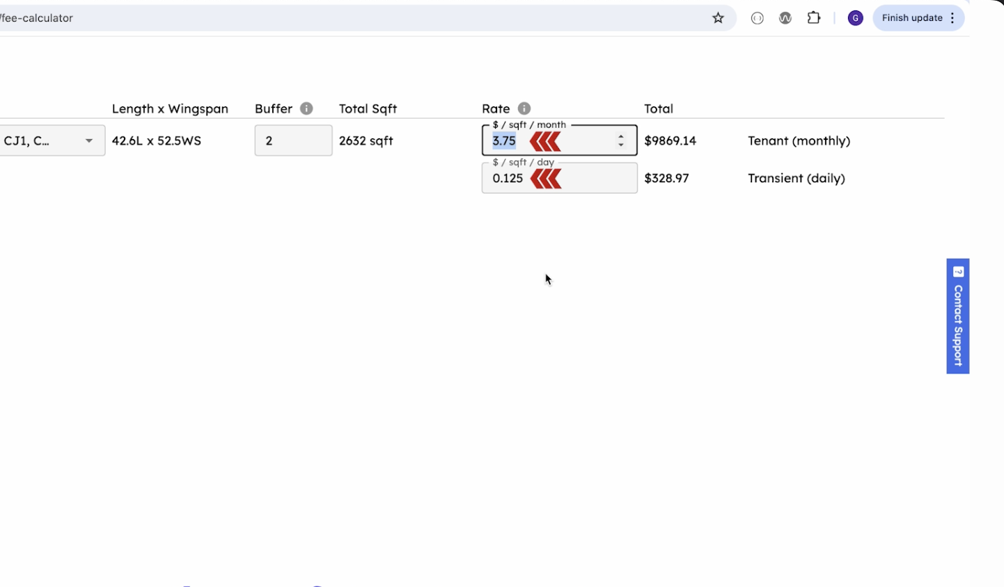 The Fee Calculator in the Left Navigation menu helps estimate charges for different aircraft types. Users can select the make and model, view aircraft dimensions, input a spacing buffer, and modify square footage rates. AirPlx then calculates the total fees for both tenants and transients.