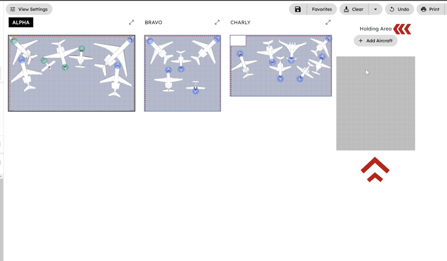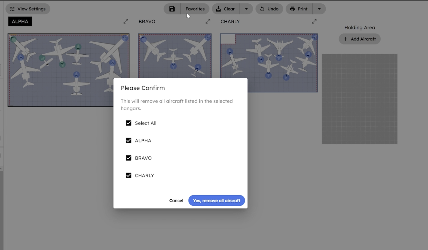 The Multi-Hangar View function on the hangar home screen allows users to simultaneously access and manage up to ten hangars. It includes a holding area for unassigned aircraft, enabling users to make refined adjustments across multiple hangars and seamlessly swap aircraft between them. Users can specify functions to apply to individual hangars and view combined or individual hangar information for efficient organization and management.