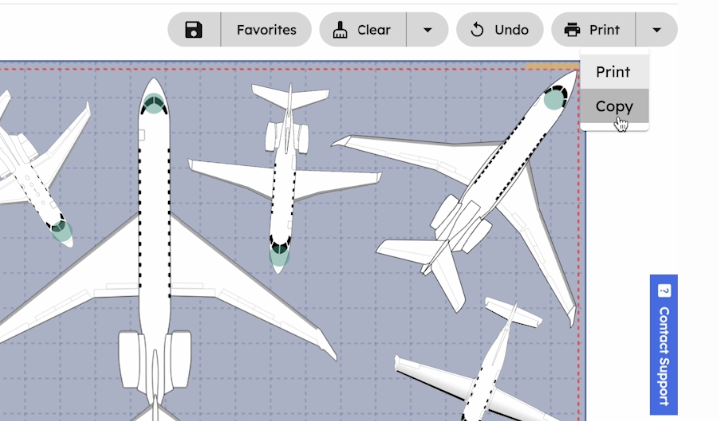 The Print/Copy function allows users to export and share hangar layouts with colleagues.