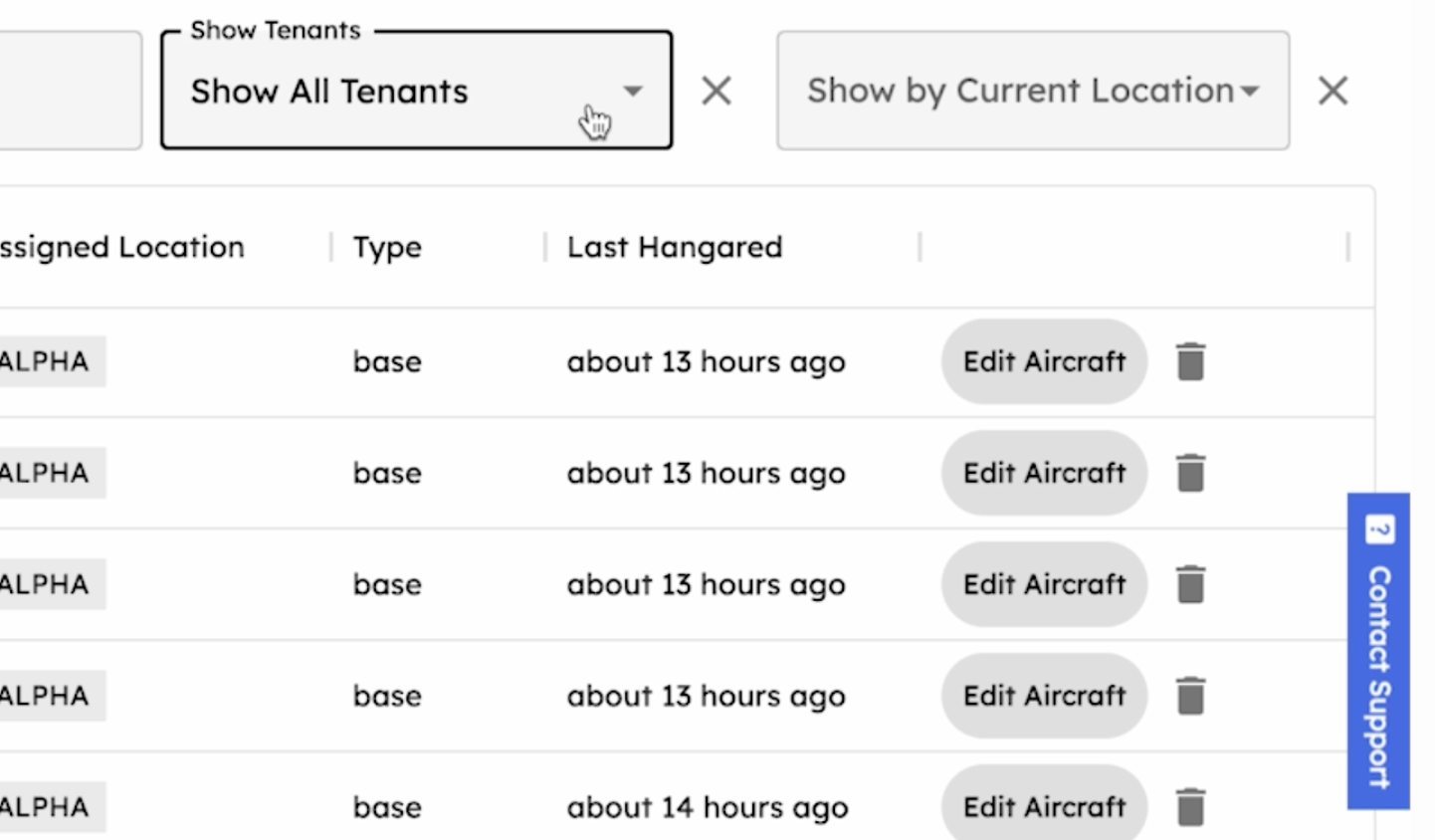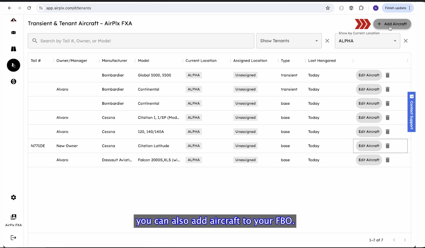 The Transient & Tenant Aircraft view function allows users to access a comprehensive list of all aircraft associated with AirPlx.